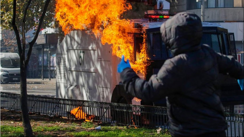 Des affrontements ont eu lieu au Chili, dans le centre de Santiago: les manifestants ont affronté les blindés des Carabiniers avec des pierres et des cocktails Molotov (photo).