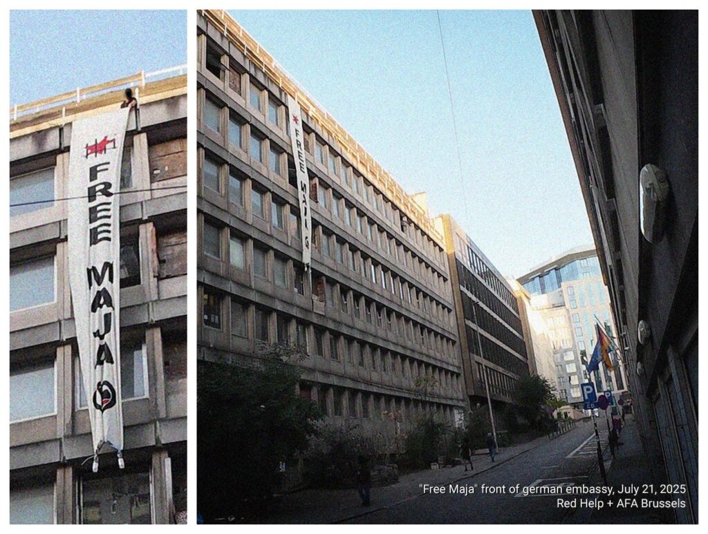 Hier à Bruxelles, des membres de l’Action antifasciste Bruxelles et du Secours Rouge ont accroché une banderole « FREE MAJA » juste face au bureau de l’ambassadeur d’Allemagne.