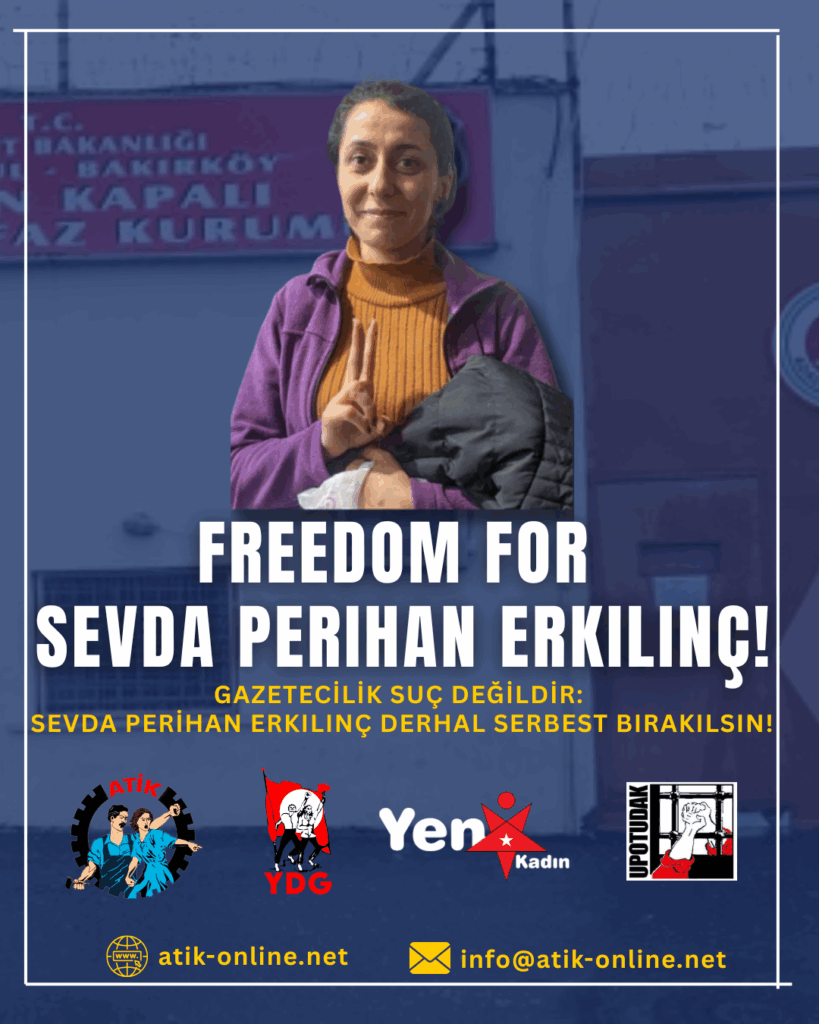 Sevda Perihan Erkılınç est une journaliste du média Özgür Gelecek, elle a été arrêtée à son domicile le matin du 29 avril dans le cadre des opérations de répression menées avant le 1er mai à Istanbul. Le bureau du procureur a justifié cette opération par des accusations en raison des « appels à manifester sur Taksim malgré les interdictions du 1er Mai » et d’une « planification de provocation ». Après deux mois d’emprisonnement, son acte d’accusation n’est pas encore rédigé alors qu’elle subit de mauvais traitements en détention.