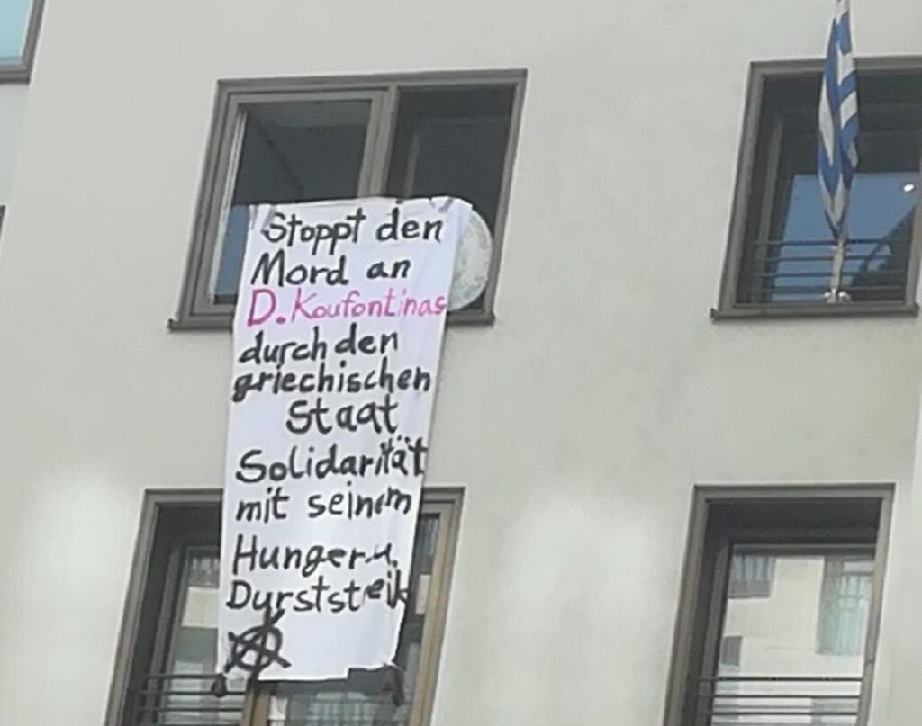 Alors que l’état grec refuse de répondre aux revendications de Dimitris Koufontinas et que la santé de celui-ci se dégrade dramatiquement, les appels de personnalités grecques de la cultures et les actions militantes solidaires se multiplient. Une manifestation a eu lieu devant la résidence officielle de la présidente grecque Katerina Sakellaropoulou. Un groupe a attaqué les bureaux de la chaîne de télévision Action24 à Athènes. Les manifestants ont jeté de la peinture et des pierres, endommageant l’entrée vitrée du bâtiment. Une personne a été arrêtée. Aujourd’hui, le consulat de Grèce à Berlin a été occupé et un rassemblement a eu lieu devant l’ambassade de Grèce à Bruxelles.