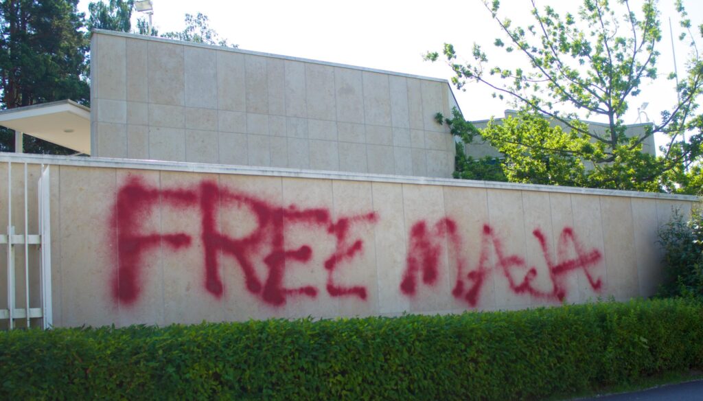 Les actions se poursuivent pour revendiquer la libération de Maja. Outre les nombreux tags (comme sur l’ambassade d’Allemagne à Helsinki le 15 juillet – photo – ou les sièges du SPD à Francfort et à Leipzig le 17 juillet) et accrochages de banderoles, on peut signaler que le 10 juillet, un véhicule de l’entrepise Stölting (un grand prestataire du système carcéral allemand) a été incendié à Berlin et que le 11 juillet, une bombe incendiaire a été placée contre un véhicule de la multinationale allemande AEG à Petralona (Athènes).