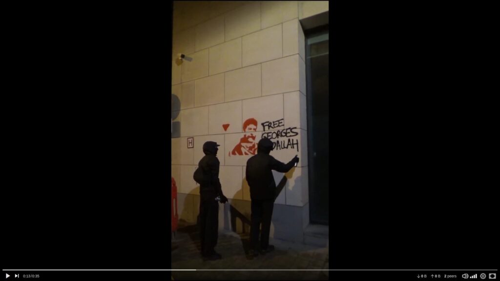 Dans la nuit du 6 au 7 octobre, des militant•es ont tagué « Free Georges Abdallah » « Free Palestine » et  « Vive la lutte armée du peeuple palestinien et libanais » sur le SPF Justice à Bruxelles pour réclamer la libération de Georges Ibrahim Abdallah et saluer la résistance des peuples opprimés par le colonialisme et l’impérialisme. Des feux d’artifices ont aussi été tirés. C’est le 7 octobre, que s’est tenu l’audience pour la libération de Georges Abdallah. Cela fait près de 40 ans que ce résistant et révolutionnaire libanais est emprisonné en France pour son combat contre l’impérialisme occidental et le régime colonial israélien. Il est le plus ancien prisonnier politique en Europe.