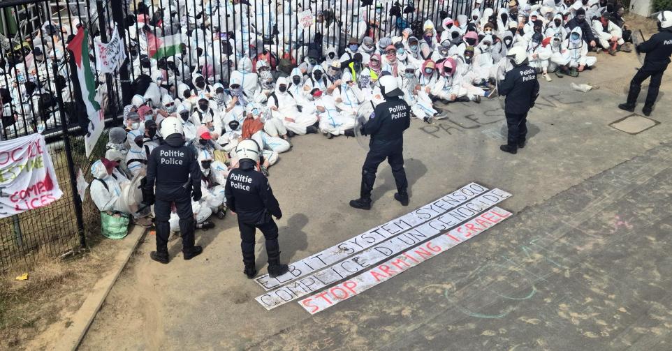 Dans le cadre de la campagne « Stop Arming Israel », des centaines d’activistes ont bloqué ce matin les sites de deux entreprises complices du génocide à Gaza. Il s’agit d’OIP (détenu par l’entreprise israélienne Elbit) dont un entrepôt situé à Tournai et contenant du matériel militaire a été encerclé puis occupé. Elbit fournit 85% des drones et la plupart des équipements militaires de l’armée israélienne. Les activistes sont ensuite partis vers Tournai, entourés d’un dispositif policier qui a essuyé des jets de projectiles. Il s’agit ensuite de Syensqo (spin-off de Solvay) à Bruxelles, qui fournit des produits à UAV Tactical System, l’entreprise spécialisée dans les drones militaires co-détenue par Elbit. Les différents accès à Syensqo ont été bloqués par les activistes, la façade du bâtiment repeinte de peinture rouge et taguée.