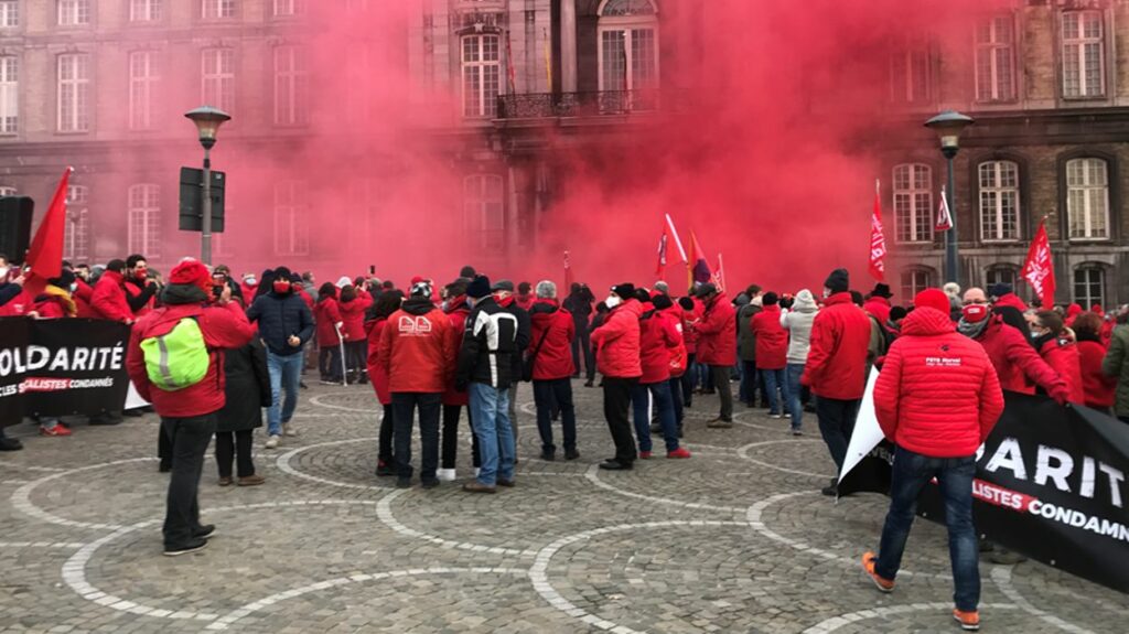 Sur la place Saint-Lambert, à l’appel de la FGTB, entre 500 et 700 militants s’étaient rassemblés masqués devant le Palais de Justice de Liège pour manifester leur solidarité avec les 17 syndicalistes condamnés le 23 novembre dernier par le tribunal correctionnel de Liège (voir notre article). Sous les fumigènes rouges, les manifestants ont réalisé une haie d’honneur pour laisser passer l’avocat des 17 syndicalistes venus déposer leur appel du jugement. Avertie de la manifestation, la police est restée discrète. Le rassemblement était autorisé pour moins de 100 personnes avec les précautions sanitaires. La police annonce donc une verbalisation pour non-respect des prescrits de l’arrêté ministériel. Organisées symboliquement à l’occasion de la journée internationale des droits humains, d’autres manifestations de la FGTB en faveur du droit de grève étaient prévues un peu partout dans le pays.