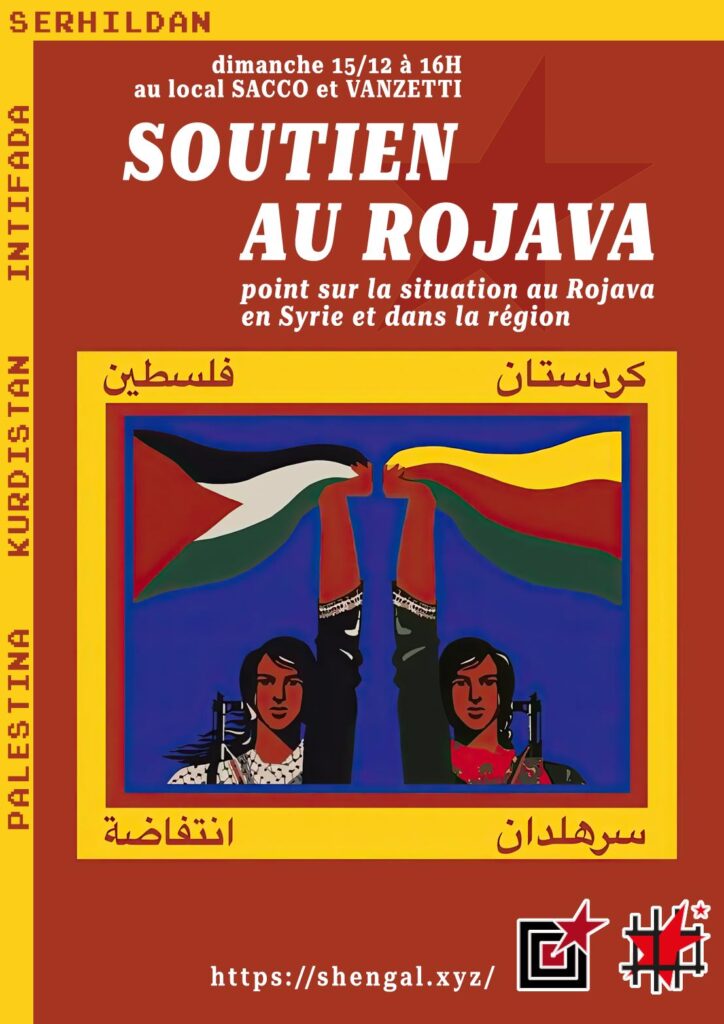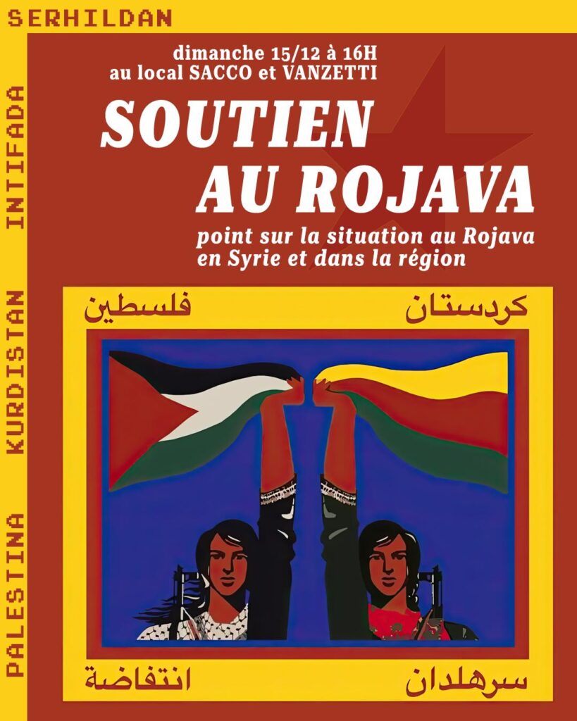 Dimanche 15/12 à 16H le Secours Rouge et Classe contre classe vous invitent à un point d’information sur la situation au Rojava, en Syrie et dans la région. Nous reparlerons également de la campagne Celox et les bénéfices de la journée iront dans la caisse de celle-ci. Pour rappel, cette campagne permet de financer des pansements hémostatiques « Celox » qui réduisent largement le taux de mortalité des combattantes et combattants des Forces Démocratiques Syriennes ainsi que des civils.