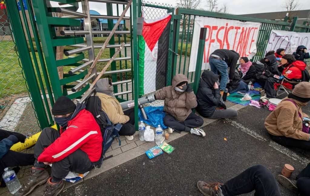 Des manifestant.e.s ont bloqué dès 7 heures du matin l’accès à l’entreprise OPI Sensor Systems à Audenarde. Cette entreprise appartient au groupe d’armement israélien Elbit Systems, qui fournit entre autres des drones et des équipements militaires terrestres de l’armée israélienne ainsi que du matériel de surveillance pour le mur en Cisjordanie. La police locale est arrivée sur place et a exigé le départ des manifestant.e.s dans l’heure mais elle a été confronté à un refus. Vers midi, des renforts de la police fédérale (dont l’équipe anti-lock-on, une auto-pompe et le bus cellulaire) sont intervenus pour mettre fin à l’action. Une vingtaine de manifestant.e.s, soit la moitié des participant.e.s ont été embarqué.e.s . Des procès-verbaux ont également été dressés. Les manifestant.e.s commencent sont maintenant (16H30) relâché.e.s au compte-goutte.