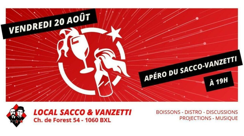 L’apéritif de ce vendredi 20 août au Sacco-Vanzetti aura lieu au profit de la Legal Team du Secours Rouge. Ce sera l’occasion de s’informer sur les activités de cette LT, et surtout l’occasion d’une rencontre amicale autour d’un verre.