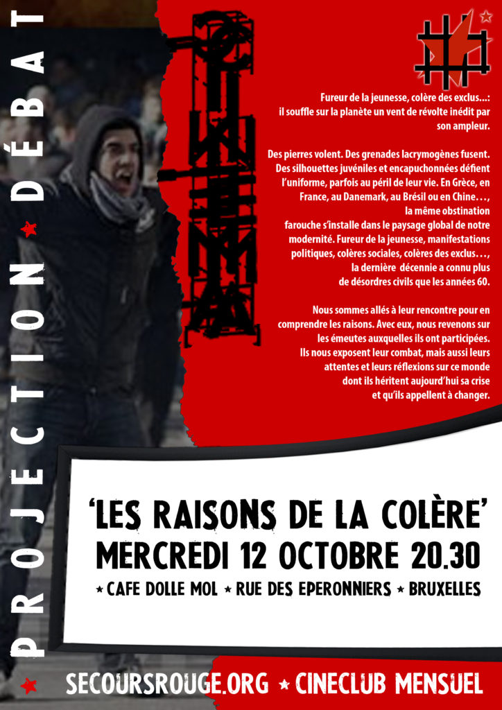 Ce mercredi 12 octobre, le Secours Rouge vous invite à venir assister à la projection du documentaire ‘Les raisons de la colère’. Celui-ci traite des désordres civils et de leur recrudescence en ce début de 21ème siècle. Des journalistes sont allés à la rencontre de jeunes qui ont pris part à ces révoltes afin d’entendre leur discours et de les laisser partager leurs aspirations et leurs réflexions. Rendez-vous au Dolle Mol, rue des Eperonniers ce 12 octobre à 20h30.
