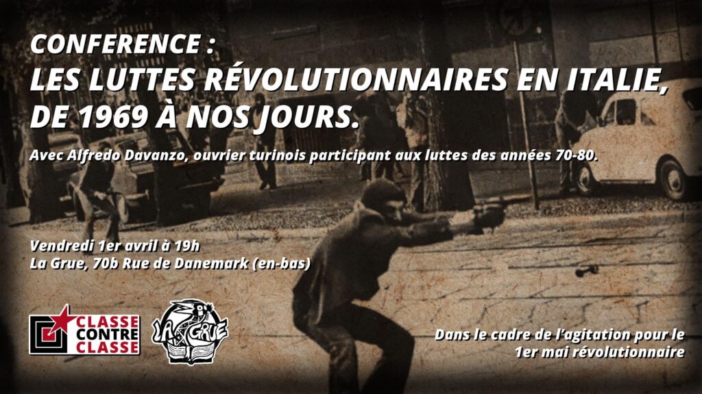 Une conférence sur les luttes révolutionnaires en Italie de 1969 à nos jours. Celle-ci se déroulera vendredi 1ier avril 2022 à 19h à la Grue (70b rue du Danemark 1060 Saint-Gilles). Alfredo Davanzo est un ouvrier turinois qui a commencé son engagement révolutionnaire dans l’autonomie des années ’70. Emprisonné dans les années 1980, il continue ensuite à militer dans des structures clandestines. En 2007, il est arrêté en temps que militant du projet Parti Communiste Politico-Militaire, ce qui lui vaudra de purger sept années de prison. Il nous parlera de l’histoire et de l’évolution des mouvements révolutionnaires italiens de 1969 à nos jours.