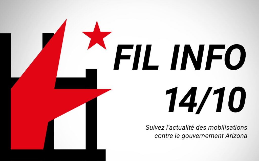 🔥 Ce mardi 14 octobre a lieu une journée de mobilisation contre le gouvernement de l’Arizona. Le numéro de notre Legal Team est le +32456200642 (via Signal de préférence). Pour suivre le déroulement des événements, voici le fil info (également disponible sur Telegram) :