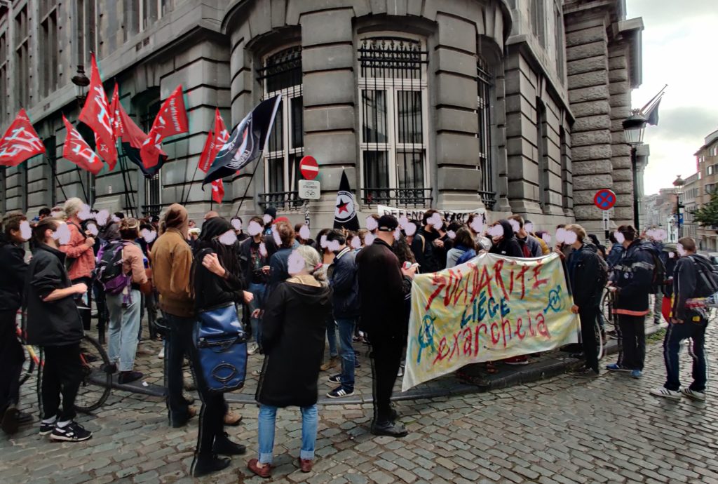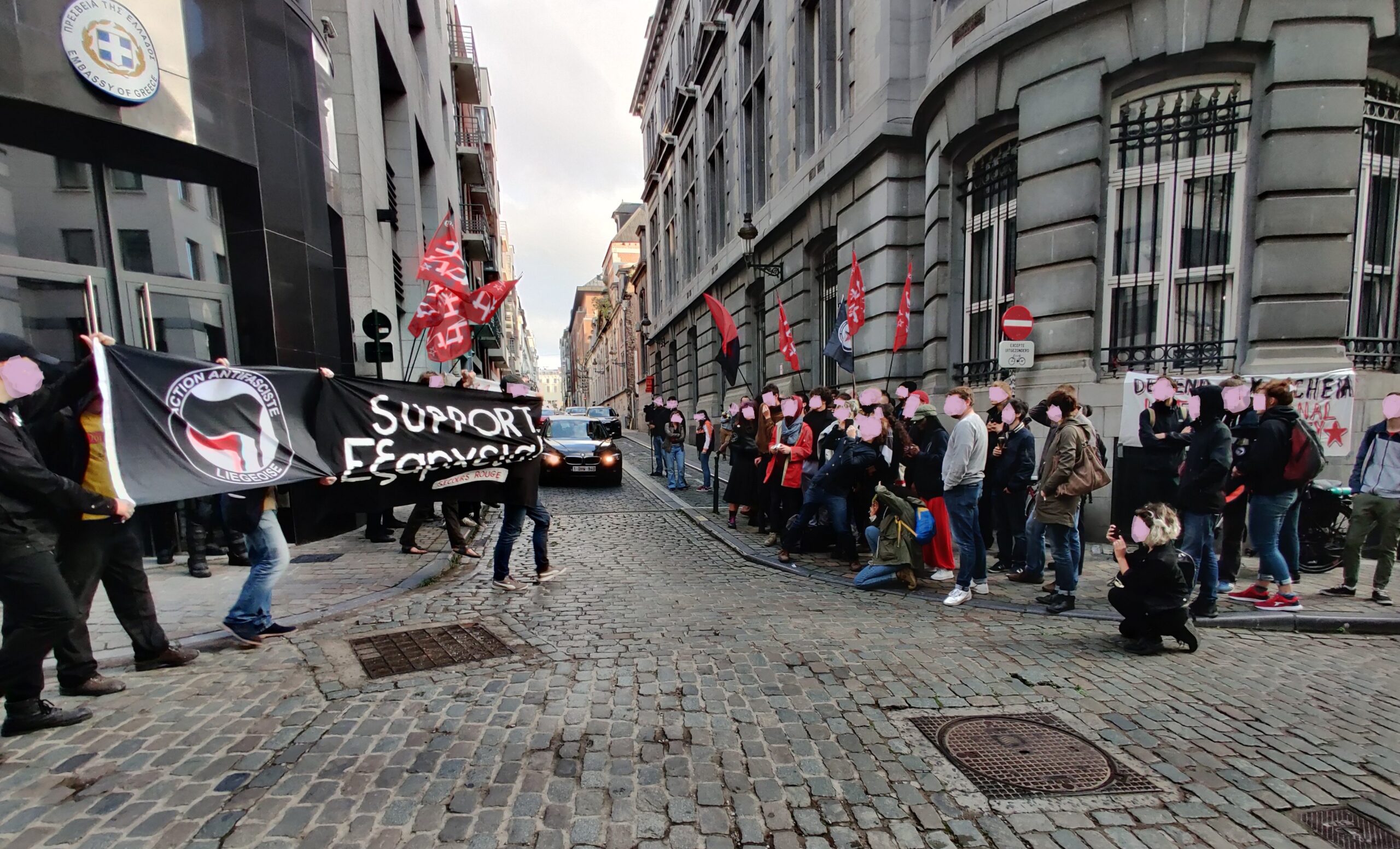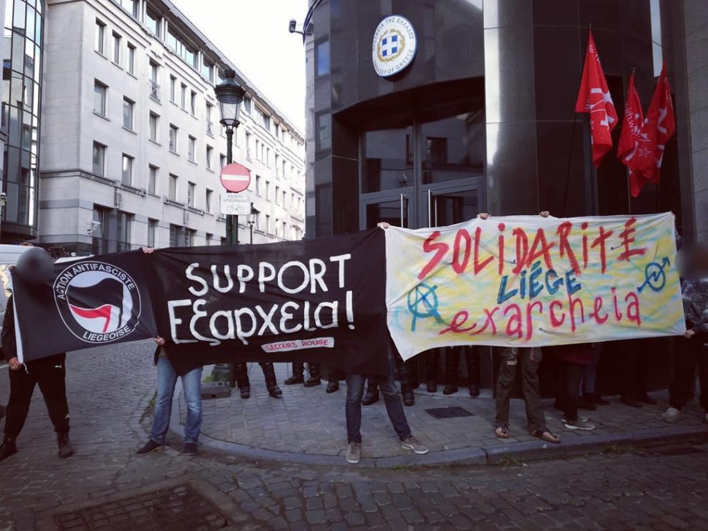 Une centaine de manifestants se sont rassemblés cet après-midi devant l’ambassade de Grèce à Bruxelles en solidarité avec le quartier rebelle d’Exarcheia à Athènes, qui a fait l’objet de plusieurs raids policiers ces dernières semaines (voir cet article et cet autre). Parmi les manifestants une grosse délégations d’antifascistes de Liège.
