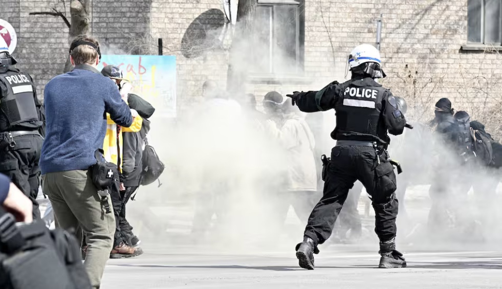 La manifestation annuelle contre la brutalité policière s’est soldée par six arrestations de samedi après-midi à Montréal. Rassemblés devant la station de métro Lionel-Groulx à Montréal, 300 militants ont scandé une poignée de slogans, tels que « tout le monde déteste la police » ou encore « trouvez-vous un vrai travail ». Des policiers ont lancé des insultes aux manifestants, allant jusqu’à arracher leurs pancartes pour ensuite les détruire. D’autres agents lourdement armés ont violemment poussé des militants qui suivaient le trajet de la manifestation. Peu de temps après s’être mis en marche le cortège, déjà escortés de près par les escouades anti-émeutes, ont trouvé sur leur chemin une rangée de policiers. La trajectoire du cortège a alors changé mais rapidement, les forces de l’ordre ont lancé des grenades lacrymogènes. Les manifestants se sont dispersés, mettant fin à la manifestation qui aura duré un peu plus d’une heure.