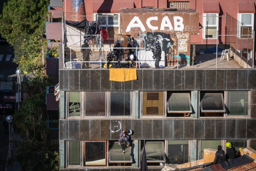 Les Mossos d’Esquadra ont expulsé jeudi matin « el Kubo » et « la Ruïna », les bâtiments squattés de la place Bonanova à Barcelone. Les policiers ont déployé un important dispositif, par le biais de la Brigade Mobile (BRIMO), pour y accéder. Un nombre considérable de squatters refusaient de partir, mais ils ont finalement été expulsés. Lors de l’expulsion du « Kubo », une personne est restée suspendue à la façade avec une corde (photo) et a été décrochée par des membres de l’unité de montagne de la police catalane, qui ont utilisé une grue, le même élément que celui utilisé lors de l’expulsion de « la Ruïna » pour faire descendre les squatters du toit. Au cours de l’opération, les agents ont même utilisé une « cage artisanale » pour se protéger des jets de projectiles divers, y compris des cocktails Molotov. L’opération a été menée à la demande du tribunal de première instance de Barcelone 3, a débouché sur l’arrestation de sept squatters, six hommes et une femme.