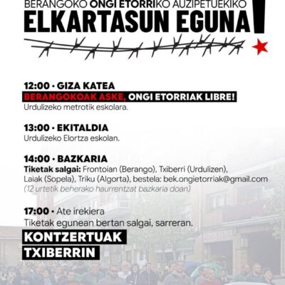 Une journée de solidarité est organisée le 24 janvier à Txiberrin (Urduliz) en soutien aux personnes de la ville de Berango poursuivies en justice pour leur engagement en faveur de l’accueil et de la solidarité aux personnes migrantes criminalisées. Cette mobilisation entend dénoncer la répression judiciaire visant des initiatives locales d’entraide et défendre le droit […]