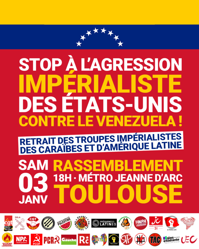 A l’appel de plus de 25 organisations, syndicats et associations, un rassemblement est organisé ce samedi 3 janvier dès 18H à la sortie du métro Jeanne d’Arc à Toulouse pour dénoncer l’agression de l’impérialisme états-unien au Venezuela. Comme le souligne l’appel commun, « il s’agit de la pointe avancée d’un redéploiement impérialiste en l’Amérique latine, après les ingérences électorales en soutien à l’extrême droite de Javier Milei ou les menaces de douane pour éviter l’incarcération du putschiste Jair Bolsonaro au Brésil. Il faut absolument réagir à cette déclaration de guerre contre le Venezuela. D’autant que la France apporte son soutien aux manœuvres de déstabilisation étasunienne par sa présence militaire dans les Caraïbes. »
