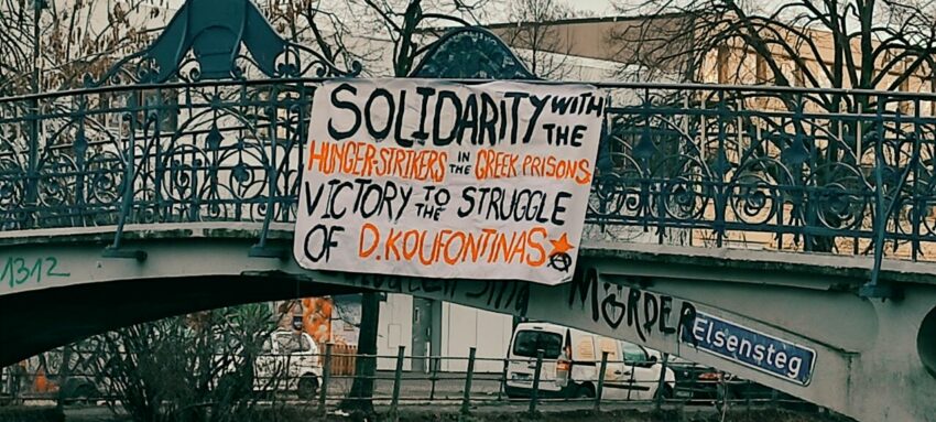 Le 8 janvier, Dimitris Koufontinas, membre de l’Organisation révolutionnaire du 17-Novembre en prison depuis 2002, a entamé une grève de la faim qui se poursuivra jusqu’à son transfert à la prison de Koridallos. La grève est longue et Dimitris est dans un état critique à l’hôpital de Lamia : selon les médecins, il pourrait s’effondrer à tout moment. Pendant la grève, de nombreuses initiatives et actions de solidarité ont eu lieu dans toute la Grèce et au-delà : protestations, manifestations, tags sur les murs, banderoles, attaques contre de multiples cibles (hommes politiques, banques, bureaux de poste, etc.). L’Assemblée de solidarité avec Dimitris Koufontinas a lancé un appel pour que le VENDREDI 12 FÉVRIER soit une journée de solidarité et d’action.