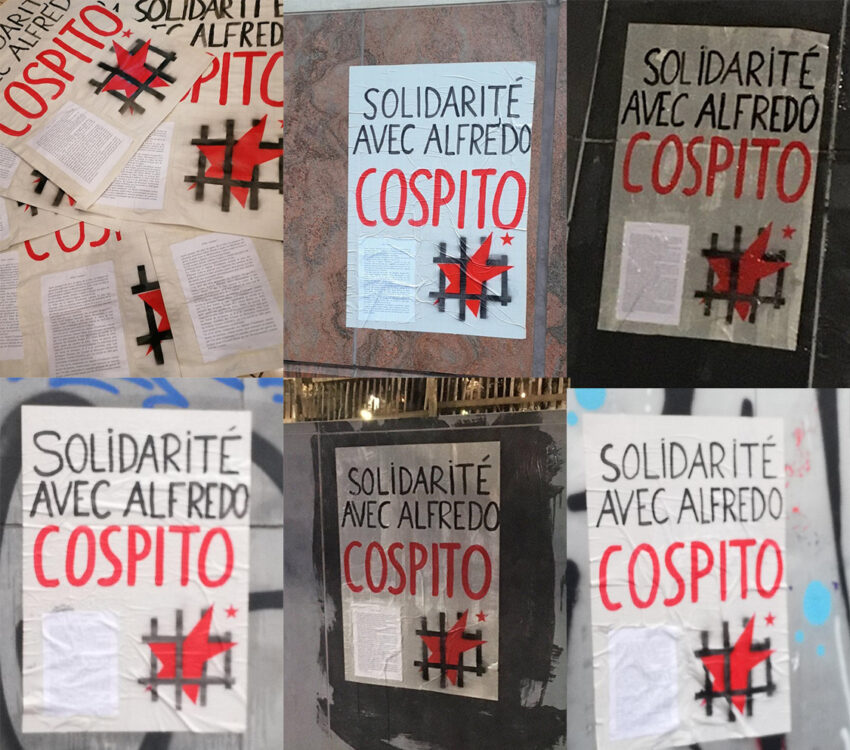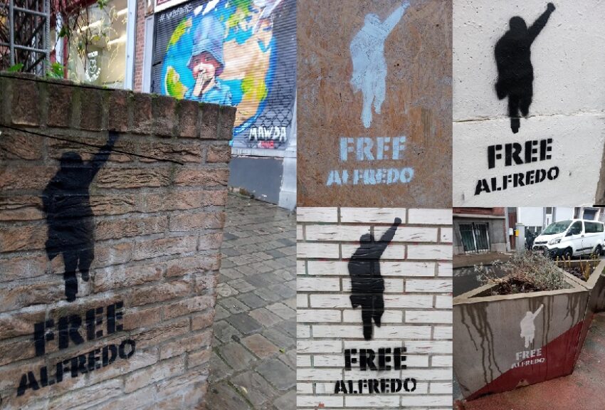 Les initiatives de soutien à Alfredo continue à se multiplier : rassemblements et manifestations, tags (sur le consulat d’Italie à Marseille, sur l’ambassade d’Italie au Portugal, un peu partout en Italie), et actions directes (attaque à l’explosif contre un tribunal de Pise, action contre la Casa d’Italia à Zurich, etc.). Voici une vidéo tentant de récapituler les initiatives solidaires à Bruxelles :