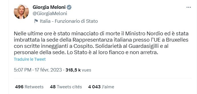 Le ministre de la Justice, Carlo Nordio, a déclaré mardi que l’État ne conclura « aucun accord » avec les anarchistes : « On ne négocie pas face à la violence », a déclaré le ministre, faisant allusion aux dernières actions radicales solidaires comme les attaques contre les représentations diplomatiques italiennes à Berlin et à Barcelone, les affrontements affrontements avec la police dans le quartier du Trastevere à Rome dans la nuit de samedi à dimanche (un policier blessé, 41 personnes ont été citées à comparaître),  une attaque au cocktail Molotov contre un poste de police de Rome le week-end dernier, de l’incendie de cinq voitures appartenant au géant des télécommunications TIM dans la capitale et de deux voitures de la police locale à Milan. M. Nordio a déclaré que la décision de le maintenir ou non dans ce régime serait prise après consultation des autorités judiciaires.