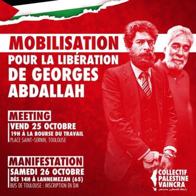 Le 7 octobre prochain, le tribunal d’application des peines tiendra audience à Lannemezan pour statuer sur la demande de libération conditionnelle (assortie d’une expulsion) déposée il y a plus d’un an par l’avocat de Georges Abdallah. La campagne unitaire pour la libération de Georges Abdallah a lancé un appel pour un mois international d’action, du 7 septembre au 7 octobre, appel co-signé par le Secours Rouge International.