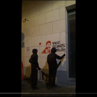 Dans la nuit du 6 au 7 octobre, des militant•es ont tagué « Free Georges Abdallah » « Free Palestine » et « Vive la lutte armée du peeuple palestinien » sur le SPF Justice à Bruxelles