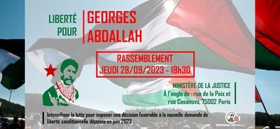 Rassemblement devant le ministère de la Justice pour exiger la libération de Georges Abdallah ce jeudi 28 septembre de 18h30 à 20h.