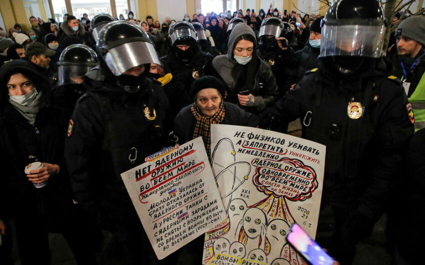 Hier samedi, la police russe a arrêté environ 500 personnes dans la trentaine de villes où des rassemblements anti-guerre ont eu lieu. Aujourd’hui dimanche, cette police a arrêté plus de 900 personnes qui participaient à des manifestations dans une quarantaine villes de Russie. Le total des manifestants arrêtés depuis le début de la guerre en Ukraine s’élèverait à 4 000. Une pétition internet contre la guerre avec l’Ukraine a obtenu plus de 800 000 signatures en deux jours, tandis que le mot-clic #нетвойне (non à la guerre) était en tête des tendances sur Twitter samedi. Deux députés communistes qui avaient voté pour la reconnaissance de l’indépendance des républiques du Donbass mardi ont dénoncé l’invasion. « J’ai voté pour la paix, pas pour la guerre […], pas pour qu’on bombarde Kiev », a écrit le député Mikhaïl Matveïev. Les anarchistes russes d’Avtonom ont carrément appelé à soutenir l’Ukraine (voir ici).