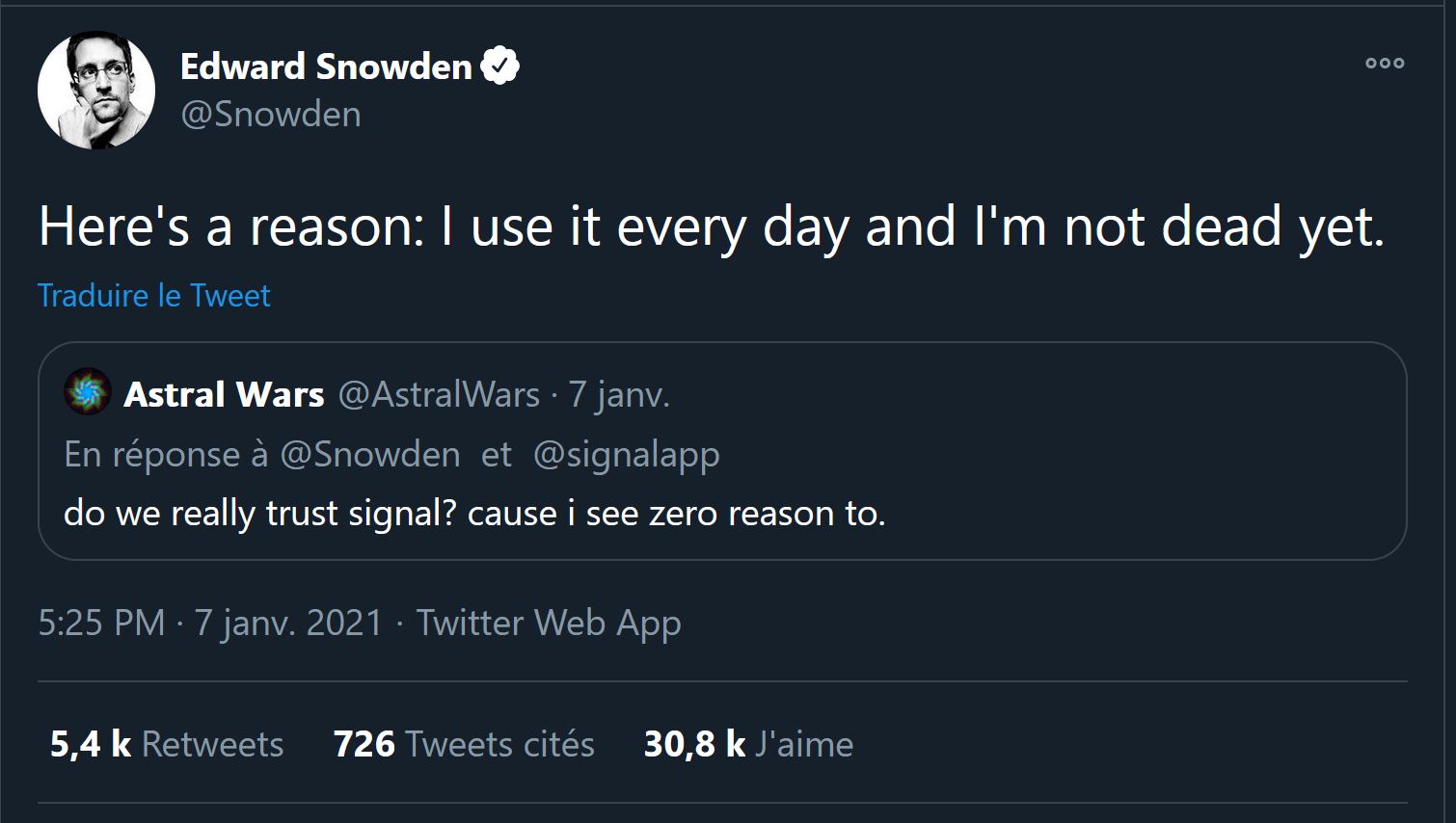 Dès le 7 janvier, Signal enregistrait une explosion des inscriptions. Quelques jours plus tard, Signal s’imposait comme l’application la plus téléchargée sur Android et iOS un peu partout dans le monde. En 2020, la Mozilla Foundation avait désigné Signal “application de communication la plus sécurisée”. Signal, en effet, reste la meilleure application de messagerie sécurisée et nous conseillons depuis des années son utilisation (voir nos articles ici et ici). Plus d’infos sur Signal ici.