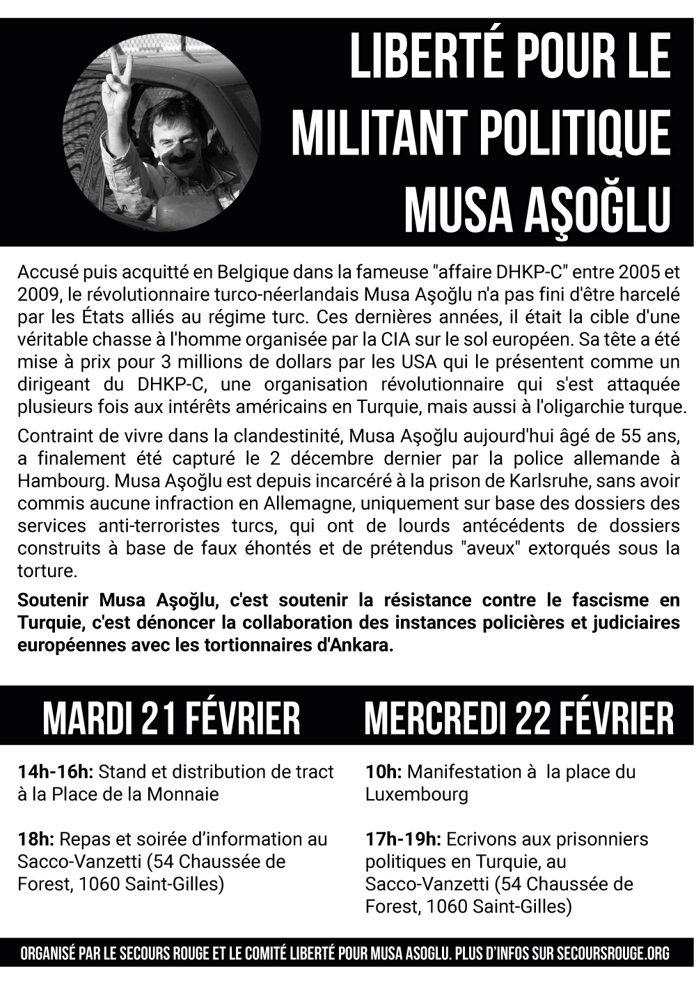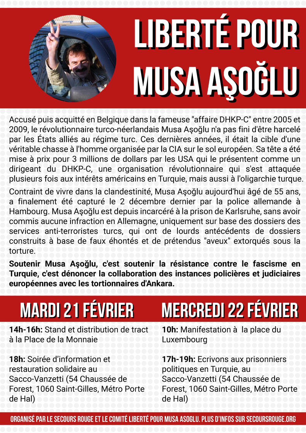 Accusé puis acquitté en Belgique dans la fameuse « affaire DHKP-C » entre 2005 et 2009, le révolutionnaire turco-néerlandais Musa Aşoğlu n’a pas fini d’être harcelé par les États alliés au régime turc. Ces dernières années, il était la cible d’une véritable chasse à l’homme organisée par la CIA sur le sol européen. Sa tête a été mise à prix pour 3 millions de dollars par les USA qui le présentent comme un dirigeant du DHKP-C, une organisation révolutionnaire qui s’est attaquée plusieurs fois aux intérêts américains en Turquie, mais aussi à l’oligarchie turque.