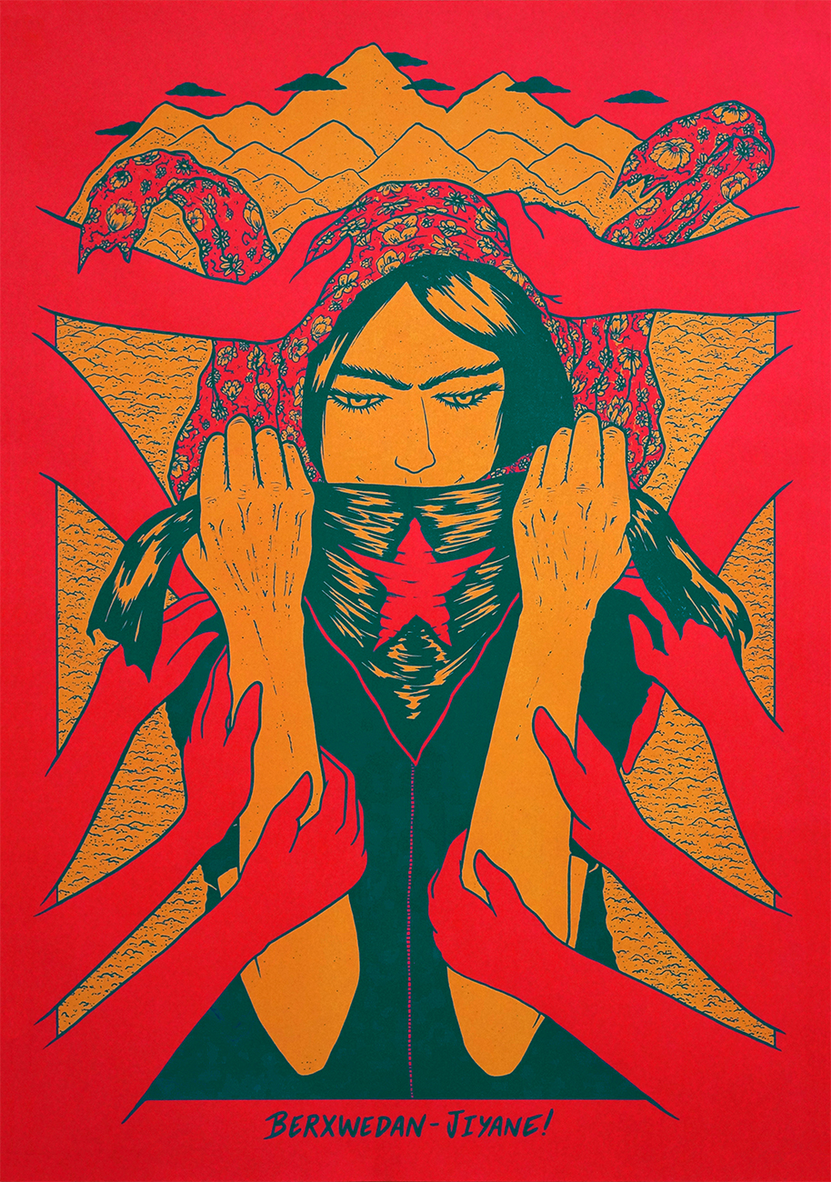 Pour promouvoir la campagne nous avons fait appel à l’artiste genevois Thomas Perrodin, afin qu’il réalise une affiche. Elle représente la solidarité qui s’est construite ,et se construit encore, avec le mouvement révolutionnaire kurde. Son tirage sérigraphié est limité à 100 exemplaires numérotés. Le prix de soutien de 30frs est entièrement utilisé pour l’achat des pansements Celox.
