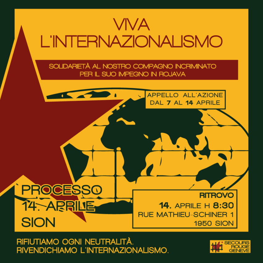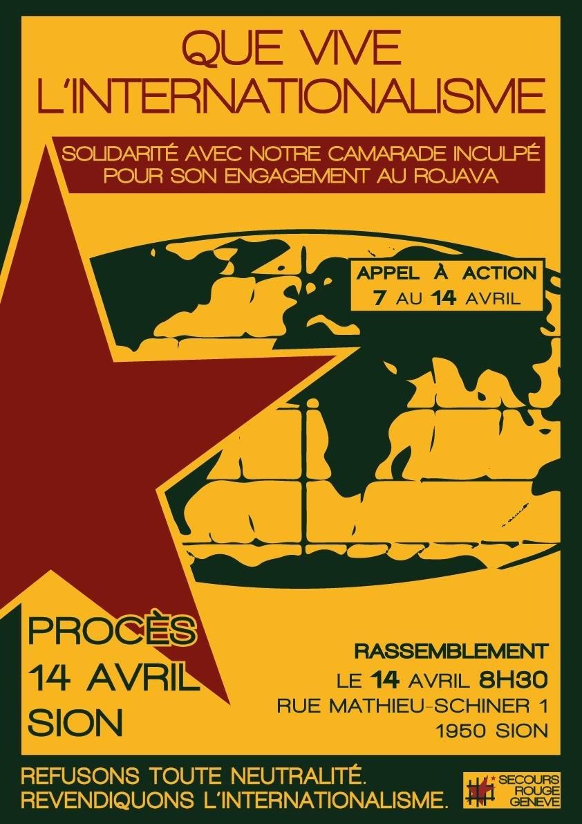 Le 14 avril, se tiendra à Sion le procès, devant la justice militaire suisse, d’un militant du Secours Rouge de Genève. Il est accusé « d’atteinte à la puissance défensive du pays » et de « service militaire à l’étranger ». L’État suisse lui reproche d’avoir pris les armes au Rojava entre 2015 et 2016 contre Daesh. Une mobilisation solidaire aura lieu ce jour à Sion. Lire la déclaration du Secours Rouge de Genève