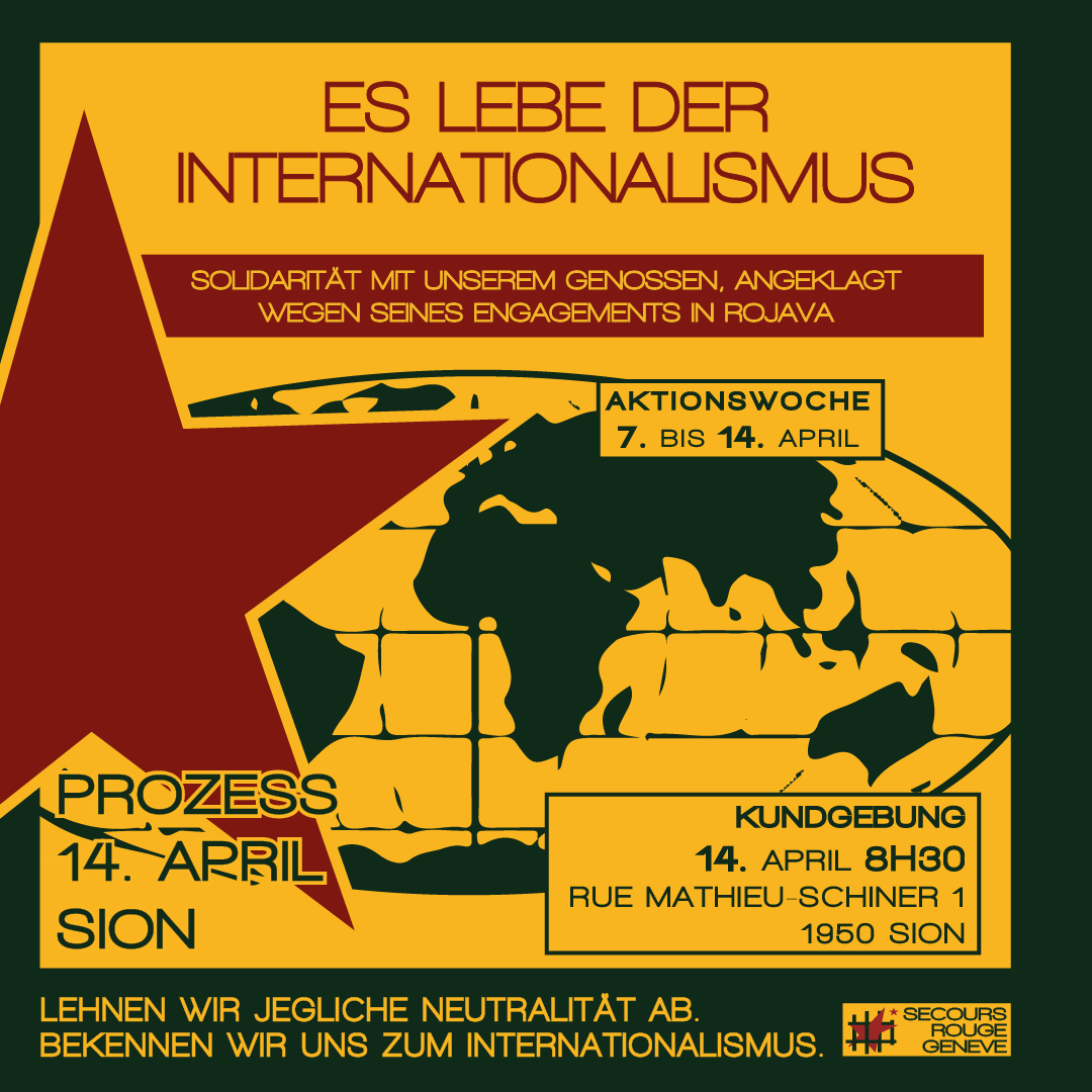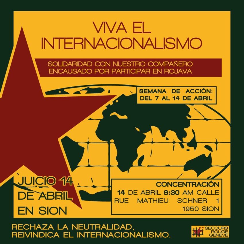 Am 14. April 2023 findet sein Prozess in Sion statt. Ihm wird « Beeinträchtigung der Verteidigungskraft des Landes » sowie « Militärdienst im Ausland » vorgeworfen. Der Schweizer Staat wirft unserem Genossen vor, gegen Daesh zu den Waffen gegriffen zu haben, ohne dafür irgendwelche Beweise zu haben. Wir halten es für wichtig, darauf hinzuweisen, dass es in Wirklichkeit nicht nur um diesen Vorwurf an sich geht, sondern auch darum, den Internationalismus und die Unterstützung der Revolution in Rojava zu delegitimieren und entpolitisieren.