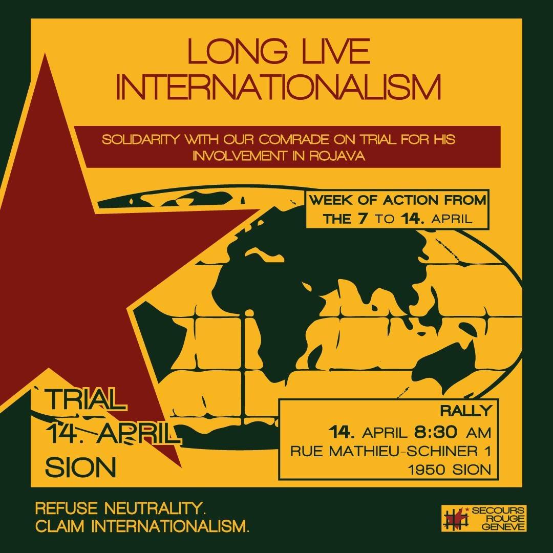 14 Nisan 2023 tarihinde Sion’de duruşması gerçekleşecek. « Ülkenin savunma gücünü zayıflatmak » ve « yurtdışında askeri hizmet » ile suçlanıyor. İsviçre devleti, herhangi bir kanıta sahip olmaksızın yoldaşımızı IŞİD’e karşı silahlanmakla suçluyor. Burada söz konusu olanın sadece bu suçlamanin kinanmasi degil, aynı zamanda enternasyonal devrimciligin ve Rojava’daki devrime verilen desteğin kriminalize edilmesinin kinanmasi yani burjuva adaletin teshir edilmesi gunun asli gorevidir.