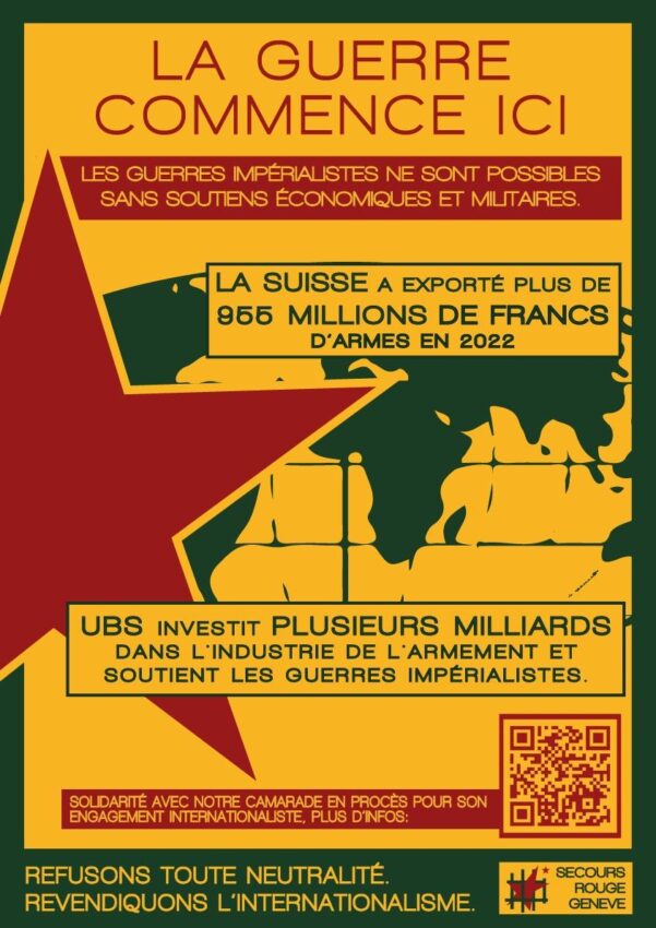 L’État suisse attaque notre camarade, car ses actions pourraient porter atteinte à la sacro-sainte « neutralité » helvétique et ainsi nuire à « la puissance défensive du pays ». Il nous semble important de rappeler ici que la Suisse a été un fournisseur d’armes au régime fasciste turc jusque très récemment, et que ce même régime a soutenu Daesh en Syrie et en Irak. Aujourd’hui encore, il soutient les milices islamistes actives dans la région et a même envahi une partie du territoire syrien pour les appuyer. Si les ventes d’armes ont été suspendues, la collaboration économique continue. Nombre de grandes entreprises suisses investissent en Turquie, profitant des avantages donnés par le régime fasciste en place. La « neutralité » Suisse n’est donc bien qu’une façade pour cacher son rôle dans l’impérialisme occidental. Nous refusons, quant à nous, toute neutralité, car nous croyons à l’internationalisme et nous nous tenons coude à coude avec nos camarades qui luttent contre l’impérialisme à travers le monde. L’État suisse a toujours eu une politique répressive avec les militantes et militants qui s’inscrivaient dans une démarche internationaliste, que ce soit lors de la guerre d’Espagne ou de la Résistance française pour ne citer que ces exemples.