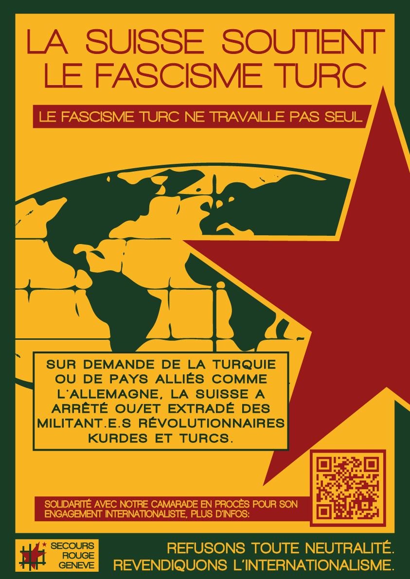 Lo Stato svizzero attacca il nostro compagno, perché le su azioni potrebbero minare la sacrosanta « neutralità » svizzera e quindi danneggiare la « potenza difensiva del Paese ». È importante ricordare che la Svizzera è stata fornitrice di armi al regime fascista turco fino a poco tempo fa, e che questo stesso regime ha sostenuto Daesh in Siria e in Iraq. Ancora oggi, sostiene milizie islamiste attive nella regione e ha persino invaso parte del territorio siriano per sostenerle. Mentre la vendita di armi è stata sospesa, la collaborazione economica continua. Molte grandi aziende svizzere investono in Turchia, approfittando dei vantaggi offerti dal regime fascista in vigore. La « neutralità » della Svizzera è quindi solo una facciata per nascondere il suo ruolo nell’imperialismo occidentale. Noi, da parte nostra, rifiutiamo qualsiasi neutralità, perché crediamo nell’internazionalismo e ci schieriamo spalla a spalla con le nostre compagne e i nostri compagni che lottano contro l’imperialismo in tutto il mondo. Lo Stato svizzero ha sempre avuto una politica repressiva nei confronti degli attivisti che facevano parte del movimento internazionalista, sia durante la guerra di Spagna che durante la Resistenza francese, solo per citarne alcuni esempi.