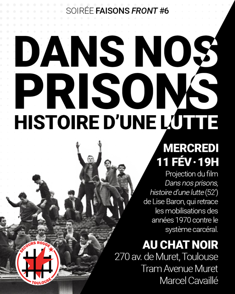 Le mercredi 11 février à 19h, le film de Lise Baron, Dans nos prisons, histoire d’une lutte (52’), sera projeté au Chat Noir à Toulouse (270 avenue de Muret). Le documentaire retrace les mobilisations des années 1970, quand détenues, familles et militants, dont le Groupe d’information sur les prisons, ont mené mutineries et actions collectives […]
