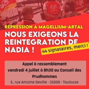 Vendredi 4 juillet à Toulouse, près d’une centaine de personnes se sont rassemblées à l’occasion de la tenue de l’audience aux Prud’hommes de Nadia, syndicaliste licenciée par le sous-traitant en ingénierie Magellium-Artal en raison de son engagement militant. À l’appel de plus de 40 organisations, la mobilisation a été l’occasion de dénoncer la répression anti-syndicale […]