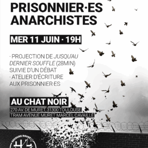 A l’occasion du 11 juin – Journée internationale de solidarité avec Marius Mason et toustes les prisonnier·es anarchistes de longue durée, le Secours Rouge Toulouse organise une soirée de solidarité le mercredi 11 juin à 19H au Chat Noir (270 avenue de Muret). Après la projection de “Jusqu’au dernier souffle” sur la grève de la […]