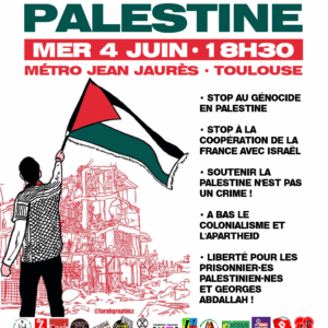 À l’appel de près d’une trentaine d’organisations politiques, syndicales et associatives, une manifestation de soutien à la Palestine est organisée ce mercredi 4 juin à 18h30 au départ du métro Jean Jaurès à Toulouse autour des revendications suivantes : Stop au génocide en Palestine Stop à la coopération de la France avec Israël Soutenir la […]