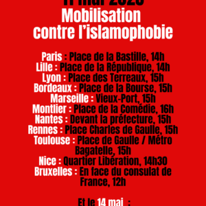 Suite à l’assassinat islamophobe d’Aboubacar Cissé dans une mosquée du Gard le 25 avril dernier, des marches contre l’islamophobie sont organisées dans une dizaine de villes en France le dimanche 11 mai 2025. A Toulouse, le Secours Rouge participera à la manifestation au départ de la place De Gaulle (métro Bagatelle) dès 15H.