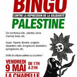 Vendredi 9 mai de 17h à 21h à la Chapelle (36 rue Danielle Casanova, Toulouse), le Comité de soutien à la Palestine, Tsedek, la librairie Tapage et la friperie Hyperpop organisent un bingo contre la répression de la solidarité avec le peuple palestinien. Cette initiative propose plusieurs lots à gagner (plantes, bons, sérigraphie, livres…) et […]