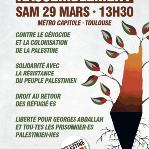 A l’occasion des commémorations de la Journée de la Terre palestinienne, le Comité de soutien à la Palestine et plusieurs organisations toulousaines appellent à se rassembler ce samedi 29 mars à 13H30 au métro Capitole à Toulouse. L’occasion d’exiger également la libération de Georges Abdallah et de tous les prisonniers palestiniens.