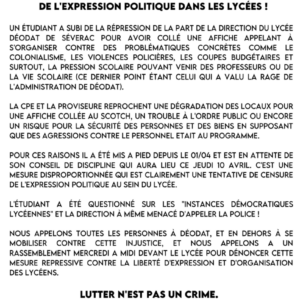 A Toulouse, la direction du lycée Déodat de Séverac a mis à pied un étudiant. Il est accusé d’avoir collé au scotch au sein de l’établissement une affiche appelant à s’organiser contre la pression scolaire ou encore les coupes budgétaires. Le jeune homme est en attente de son conseil de discipline qui aura lieu le […]