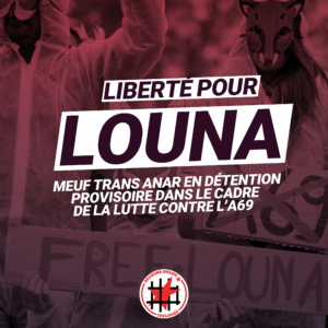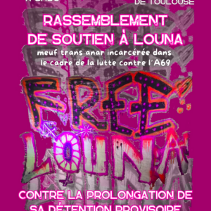 Lundi 3 février, le placement en détention provisoire de Louna, militante trans anar mobilisée contre l’A69 et incarcérée depuis octobre à Tarbes, a été renouvelé pour 4 mois (voir notre article). Elle a fait appel de la décision, et sa demande sera examinée mardi 11 février. À cette occasion, ses soutiens appellent à se rassembler […]