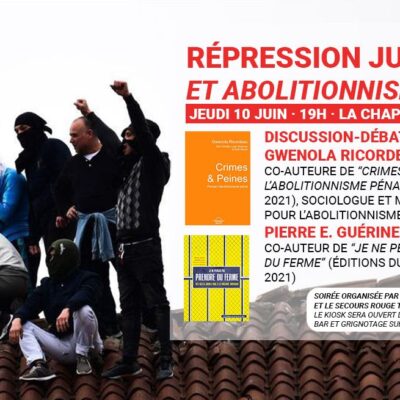 Le jeudi 10 juin 2021, à 19 heures à La Chapelle (36, rue Danielle Casanova), le Kiosk, L’Envolée et le Secours Rouge Toulouse organisent une discussion/débat autour de la répression judiciaire et de l’abolitionnisme pénal. Pour aborder ces questions – et bien d’autres –, Pierre E. Guérinet et Gwenola Ricordeau discuteront sur la base de […]