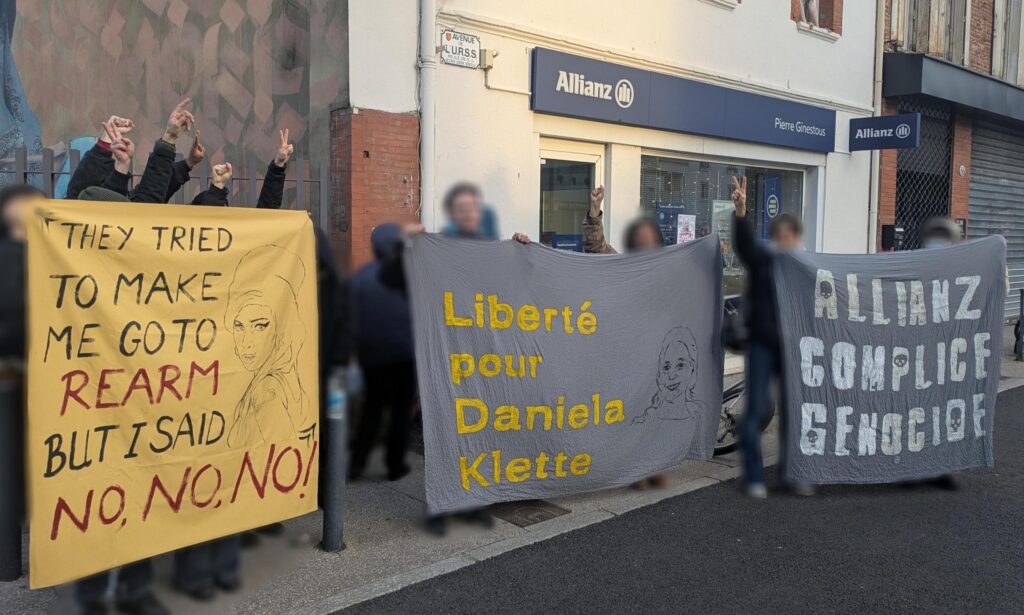 Vendredi 16 janvier à Toulouse, des militants se sont rassemblés devant une filiale d’assurance Allianz pour dénoncer le rôle du groupe, principal investisseur dans les obligations de l’État d’Israël, utilisées notamment pour financer le génocide à Gaza. L’action visait également à exprimer un soutien à Daniela Klette, révolutionnaire anti-impérialiste emprisonnée en Allemagne après 30 ans […]