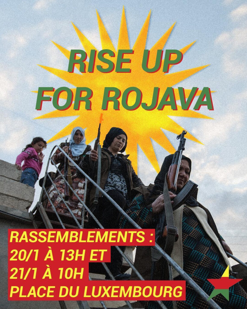 Le réseau international Rise Up 4 Rojava, auquel appartient notre Secours Rouge, appelle à deux rassemblements aujourd’hui (13H) et demain (10H) place du Luxembourg, à Bruxelles.