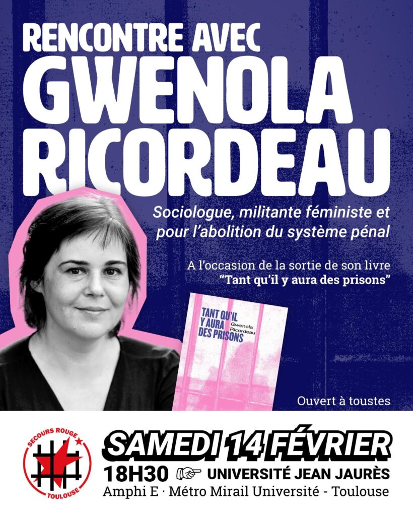 À l’occasion de la sortie de son livre Tant qu’il y aura des prisons, la sociologue, militante féministe et abolitionniste pénale Gwenola Ricordeau interviendra lors d’une rencontre publique organisée par le Secours Rouge Toulouse le samedi 14 février à partir de 18h30 à l’amphi E de l’Université Toulouse Jean Jaurès (métro Mirail Université). Dans cet […]