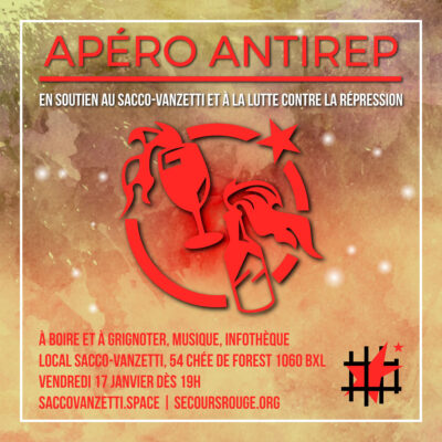 Ce vendredi 17 janvier, le Secours Rouge et le Local Sacco-Vanzetti vous accueillent vous invitent à boire un pot autour de discussions informelles sur les luttes en cours. Musique, cocktails, bonne ambiance, stand d’écriture aux prisonniers politiques et tables d’infos seront au menu comme à chaque apéro antirep’ !