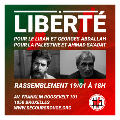Pour soutenir la lutte du peuple libanais et pour appeler à la libération de Georges Abdallah, pour soutenir la lutte du peuple palestinien et pour appeler à la libération d’Ahmad Sa’adat, le Secours Rouge International, le « Liban se soulève », le Secours Rouge Arabe, et Samidoun appellent à une Journée internationale d’action dimanche 19 janvier. Volet bruxellois de cette journée d’action : un rassemblement aura lieu devant l’ambassade libanaise, Avenue Franklin Roosevelt 101, à 1050 Bruxelles, le 19/1 à 18h.