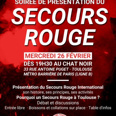 Le Secours Rouge Toulouse organise une soirée de présentation au local révolutionnaire le Chat Noir le mercredi 26 février prochain dès 19H30. Cela sera l’occasion de présenter le Secours Rouge International, ses principes et ses activités, mais aussi les raisons de la fondation de cette nouvelle structure à Toulouse. L’événement Facebook